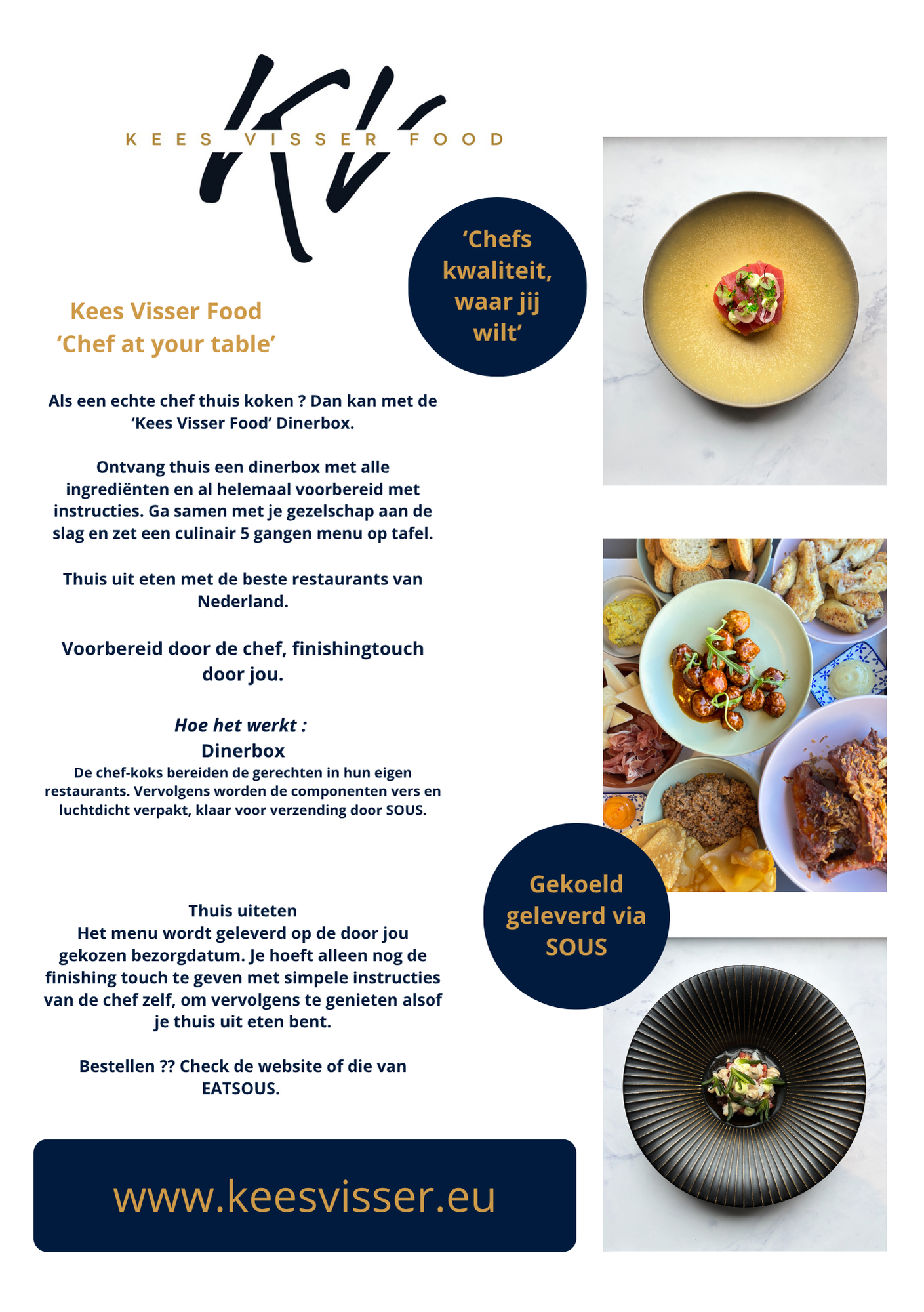 Bij Kees Visser Food draait alles om beleving aan tafel. Of het nu gaat om een intiem private-dining diner, stijlvolle catering of een menubox vol chef-kwaliteit-elk gerecht draagt de signatuur van de chef. Met aandacht bereid, met trots geserveerd. Want echte smaak begint bij vakmanschap, en dat proef je bij elke hap